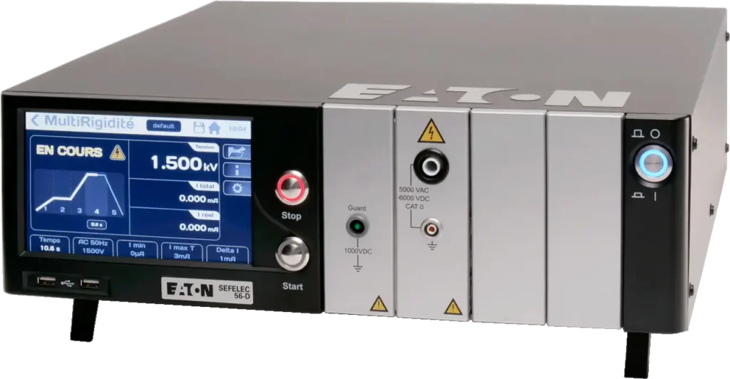 Le SEFELEC 56-D est un diélectrimètre EATON de nouvelle génération permettant les essais de rigidité diélectrique sous 5 kVAC 50 VA et 6 kVDC ainsi que les essais d’isolement de 20 à 1000 VDC jusqu’à 200 GΩ.